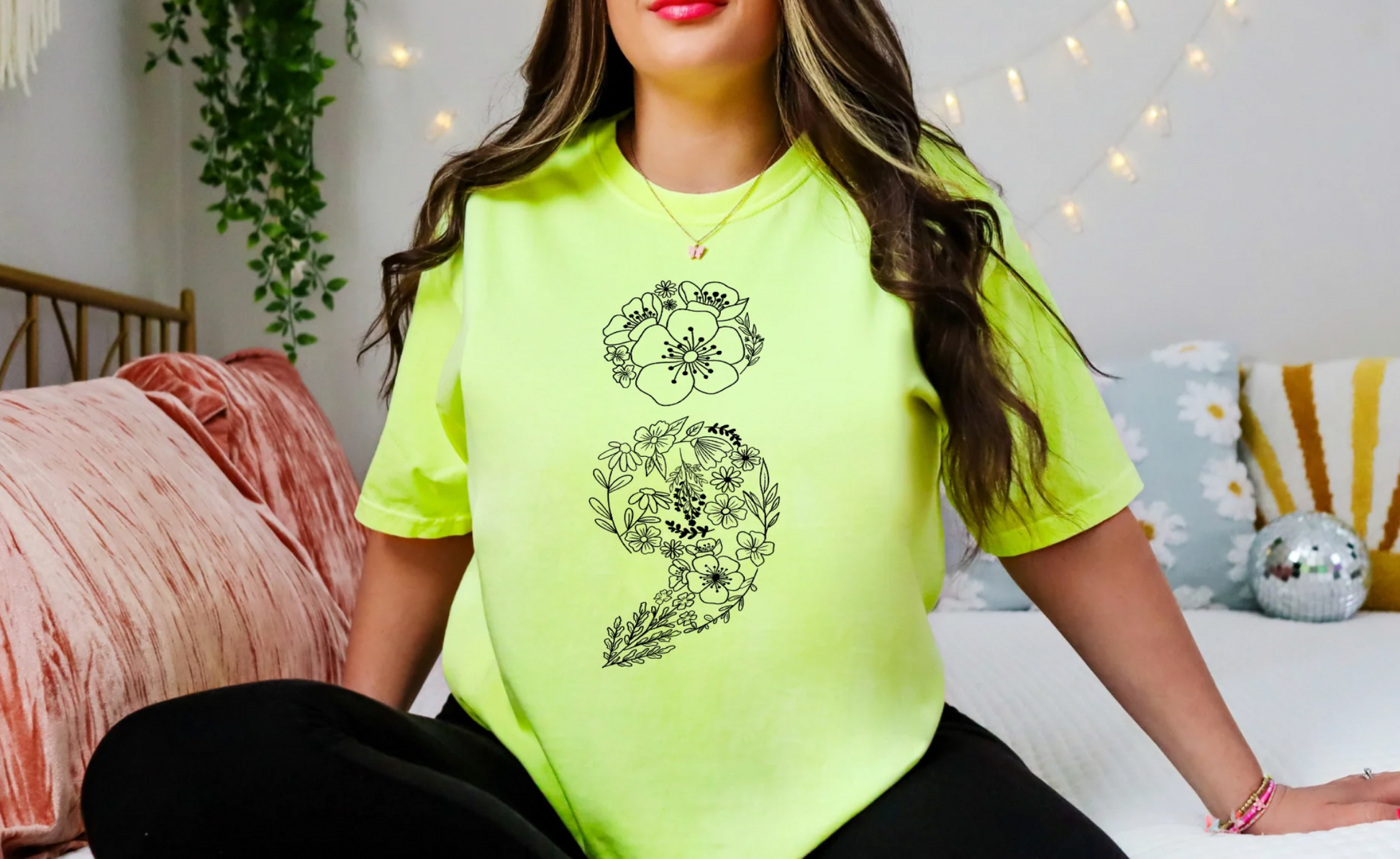 This Comfort Colors Semi Colon Tee is not just a shirt, it's a powerful statement for mental health awareness. With its beautiful orchid purple color, it's a stylish and meaningful addition to any wardrobe.